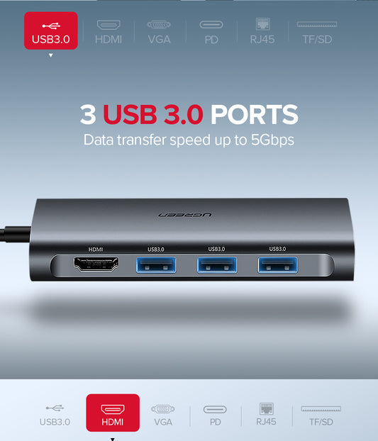 UGREEN 9 in 1 USB C Hub 3 * USB 3.0 + HDMI + VGA + RJ45 + SD Card + TF Card + USB C for Apple Macbook Huawei Samsung Phones - PH