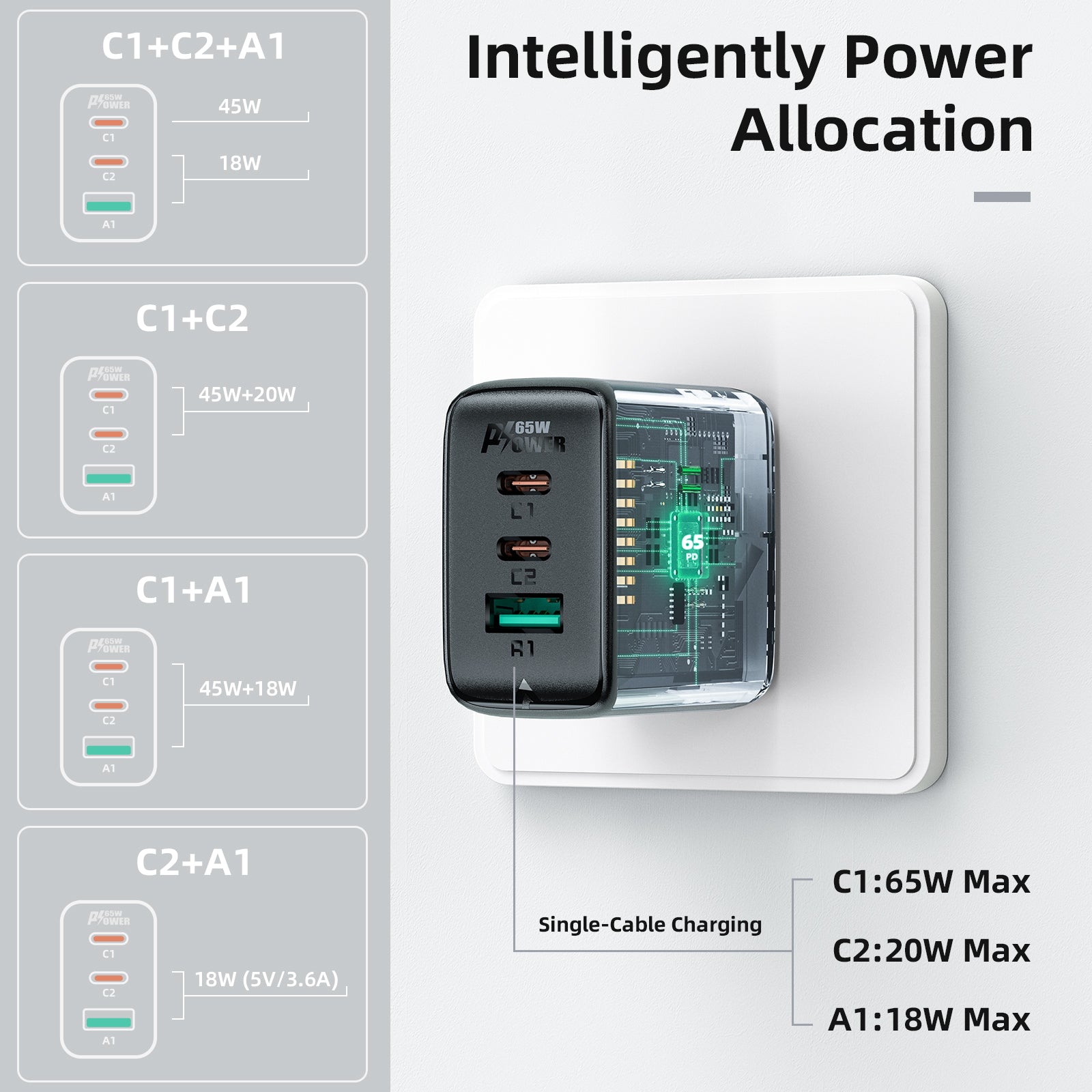 | Product name: | A15 PD65W (USB-C + USB-C + USB-A) 3-port wall charger set (US). |