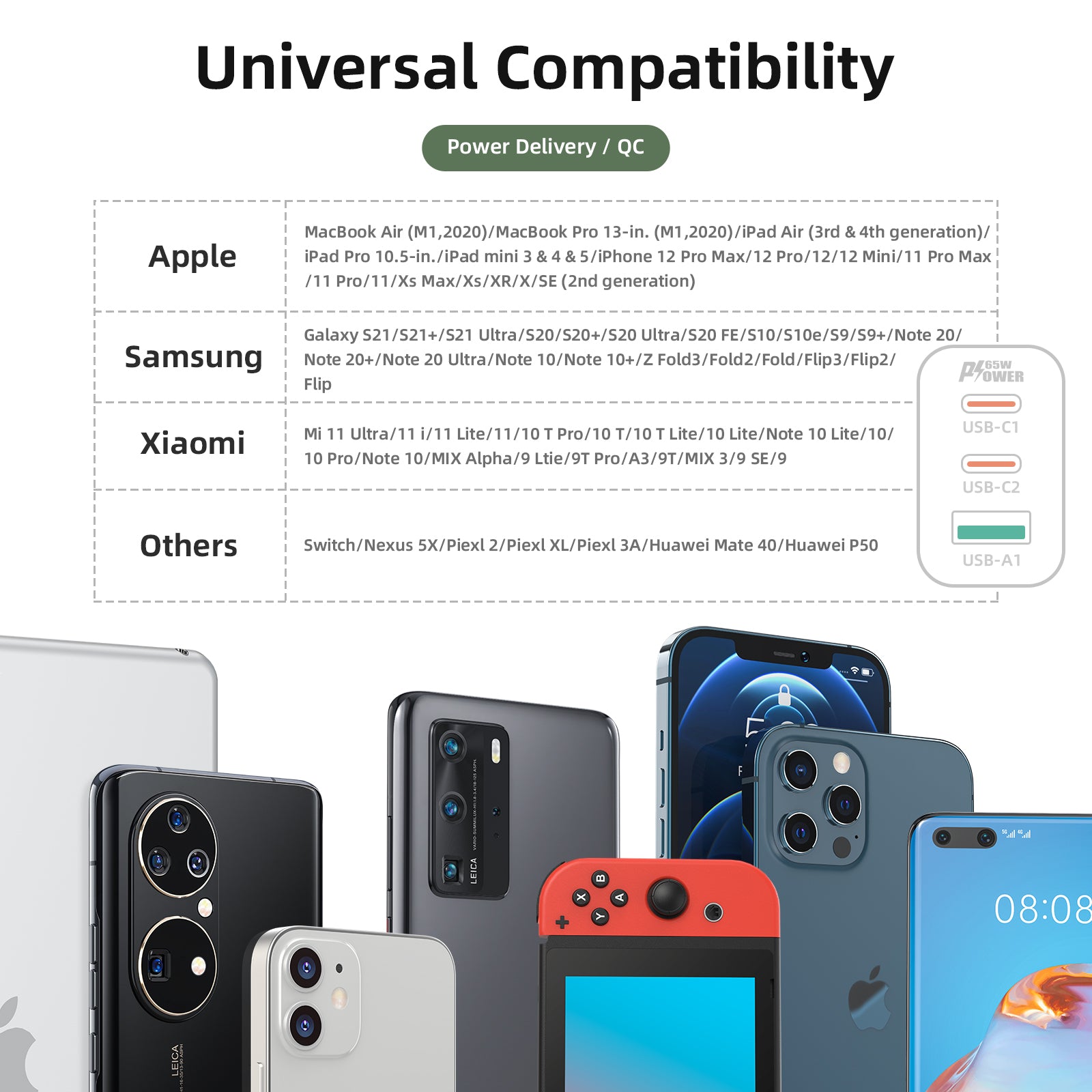 | Features 1: | Support for PD65W, for PPS, for QC3.0 / QC2.0, for AFC, for FCP and other charging protocols. Compatible with laptop, tablet PC, mobile phone charging. |