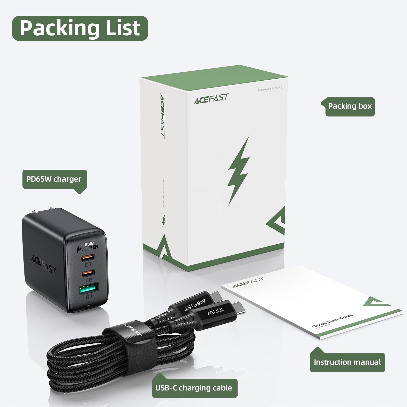 ACEFAST A15 PD65W(USB-C+USB-C+USB-A) 3-port Charger Set