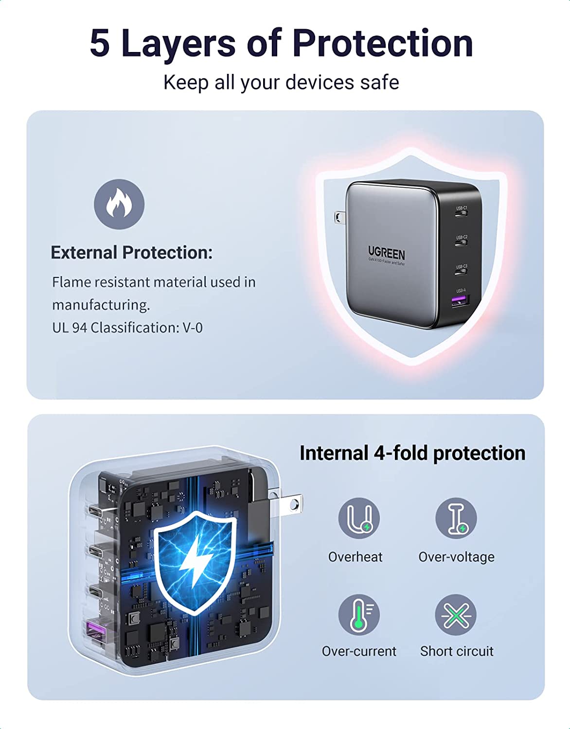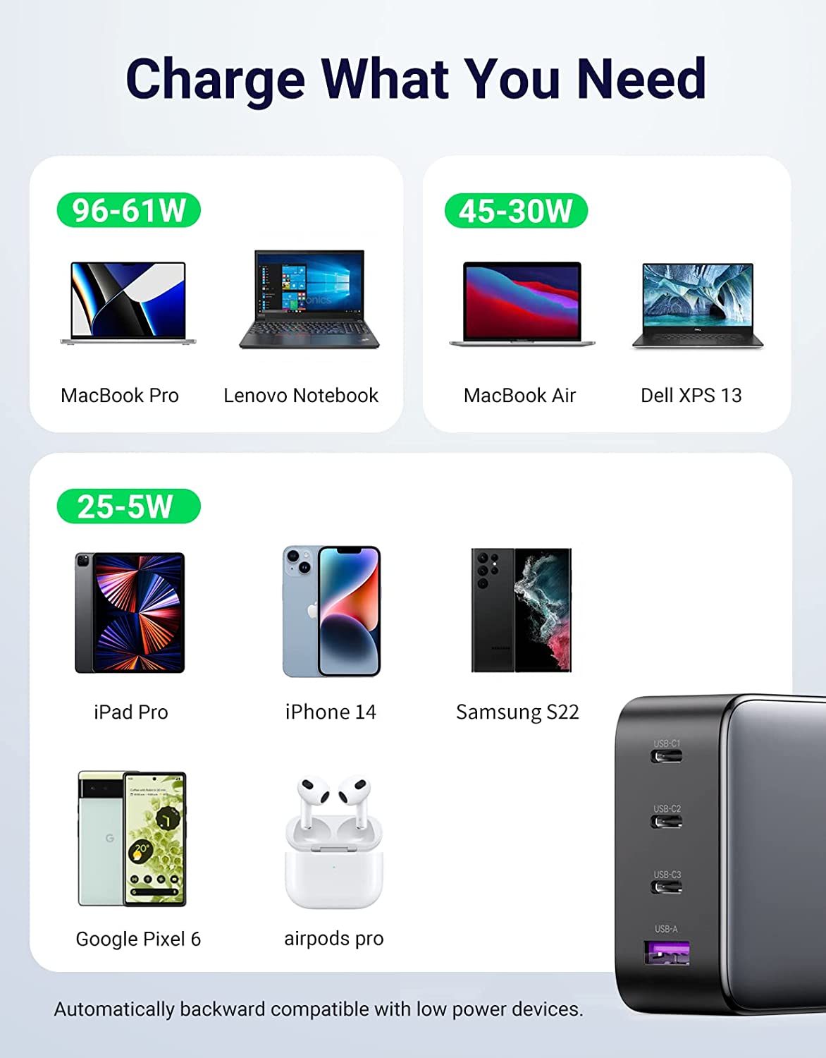 4 DevicesPowered by the Navitas GaN Power IC, the UGREEN 100W GaN Fast Charger have a smller size but stronger power.