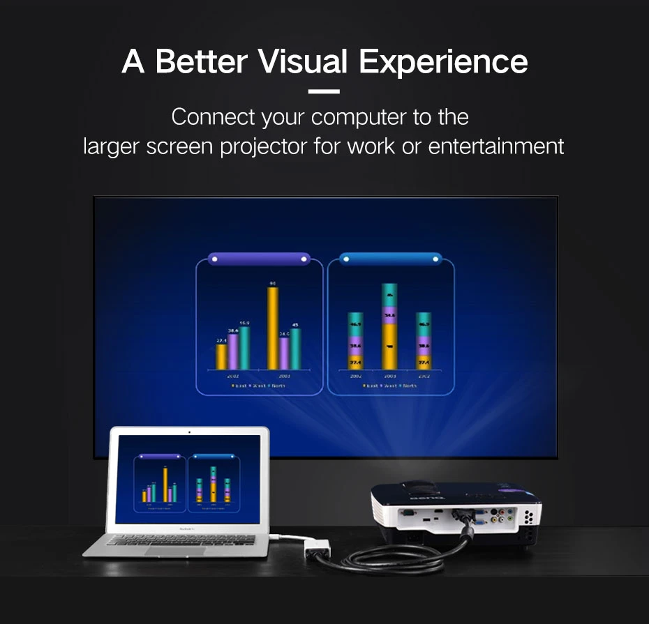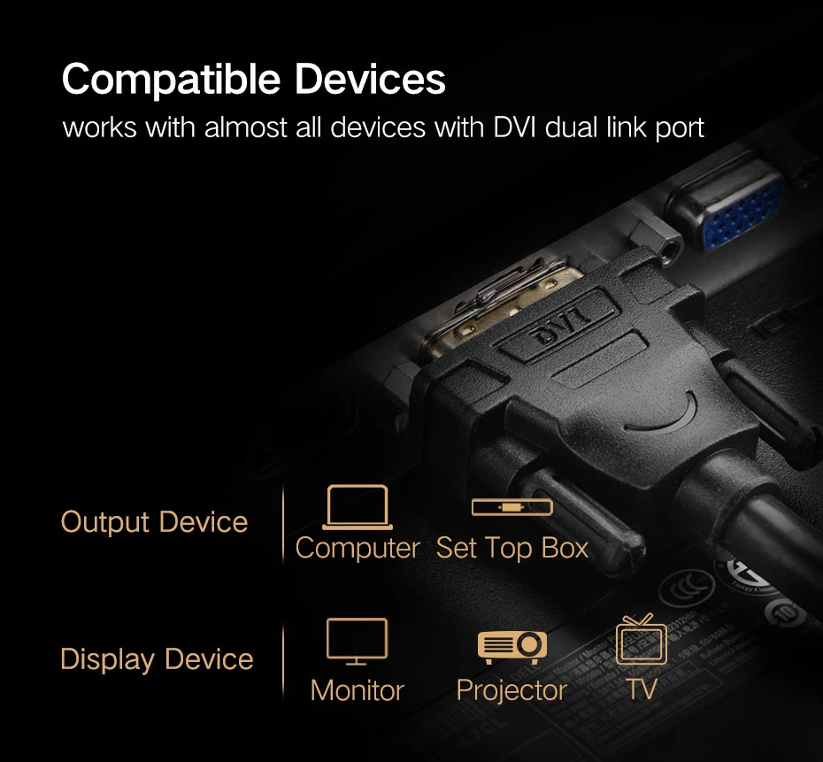 DVI to DVI cable supports resolution up to 2560x1600(2K) @ 60Hz and 1080P (Full HD).