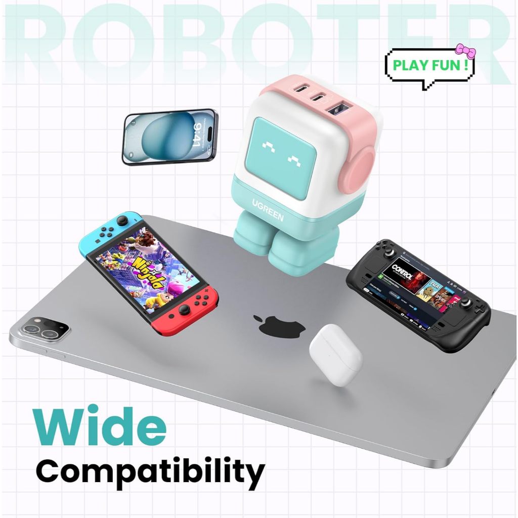 - RobotGaN Charger: Introducing our futuristic and adorable 65W USB C RobotGaN charger, this small robot-shaped charger combines functionality with playful, making it an ideal accessory for all your charging needs on the go, the shoe cover of the charger does not support magnetic wireless charging, and it is magnetic just for easy storage