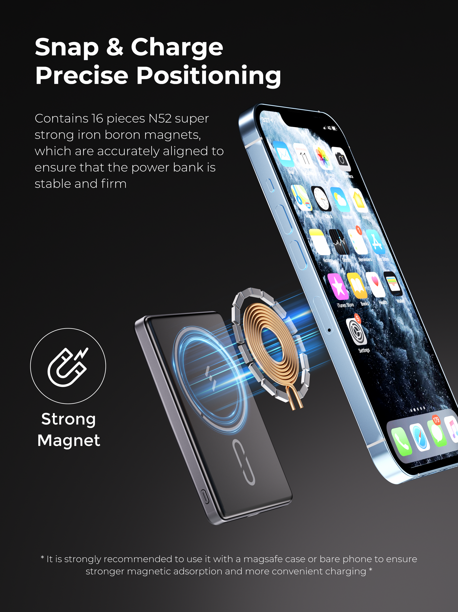 - Snap & Charge: Contains 16 pieces N52 super strong iron boron magnets, which are accurately aligned to ensure that the power bank is stable and firm.