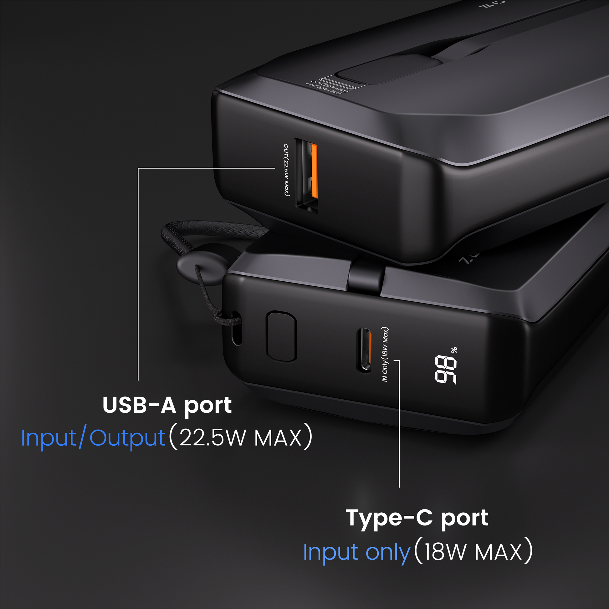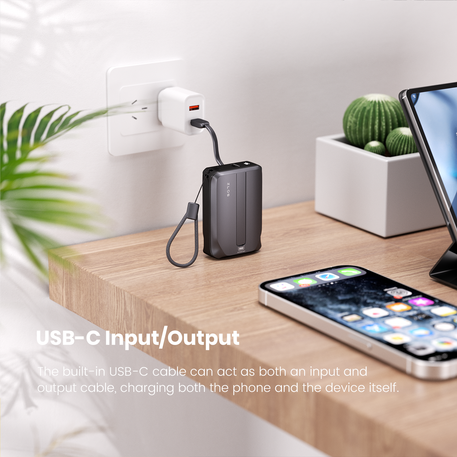 - Built-in Lightning and Type-C Cables for Charging and Recharging - TINY 10 is built in with two charging cables, one with a Lightning plug and the other with Type-C. The Type-C one can also be connected with any compatible power adaptor for recharging the power bank.